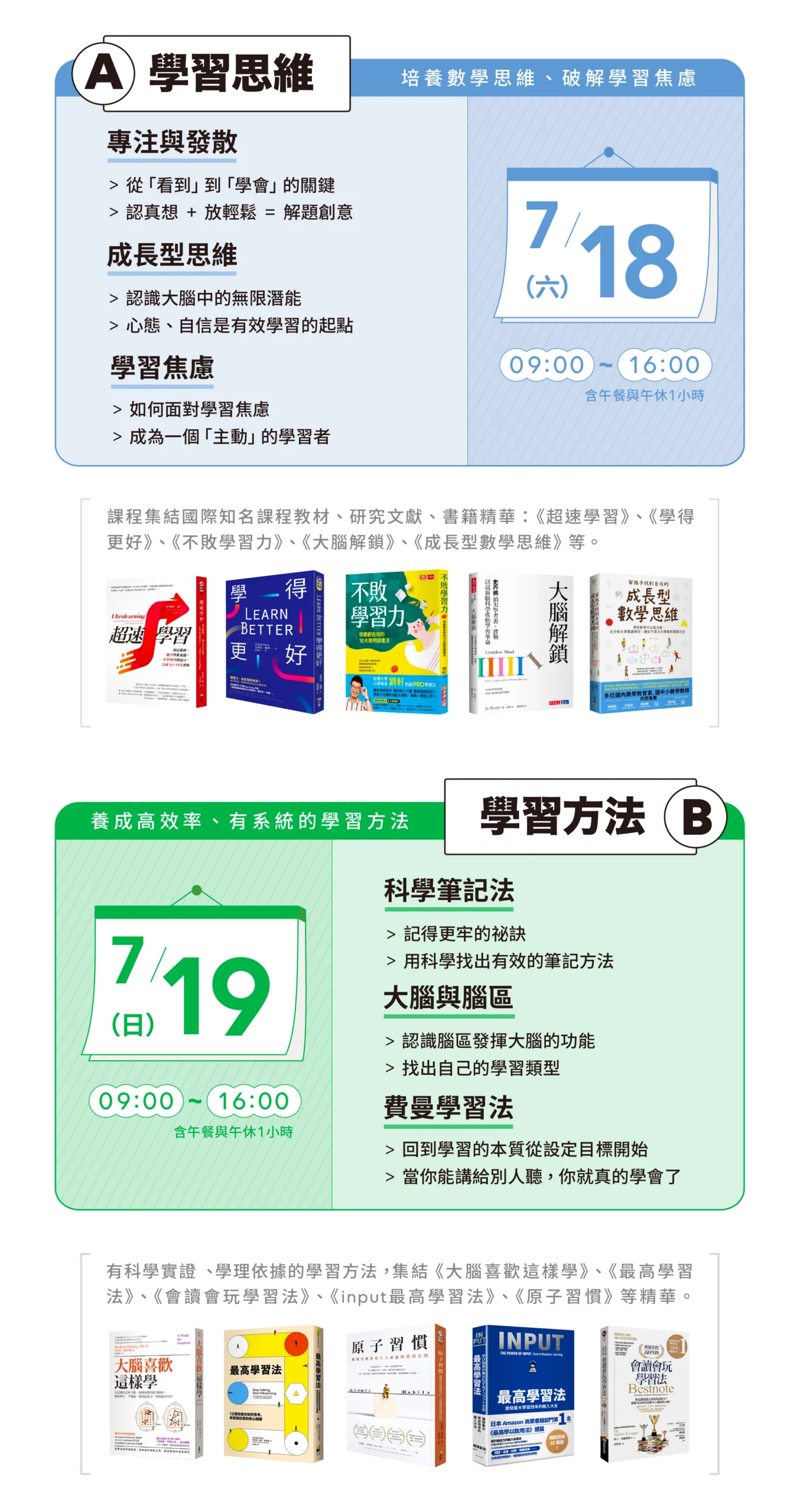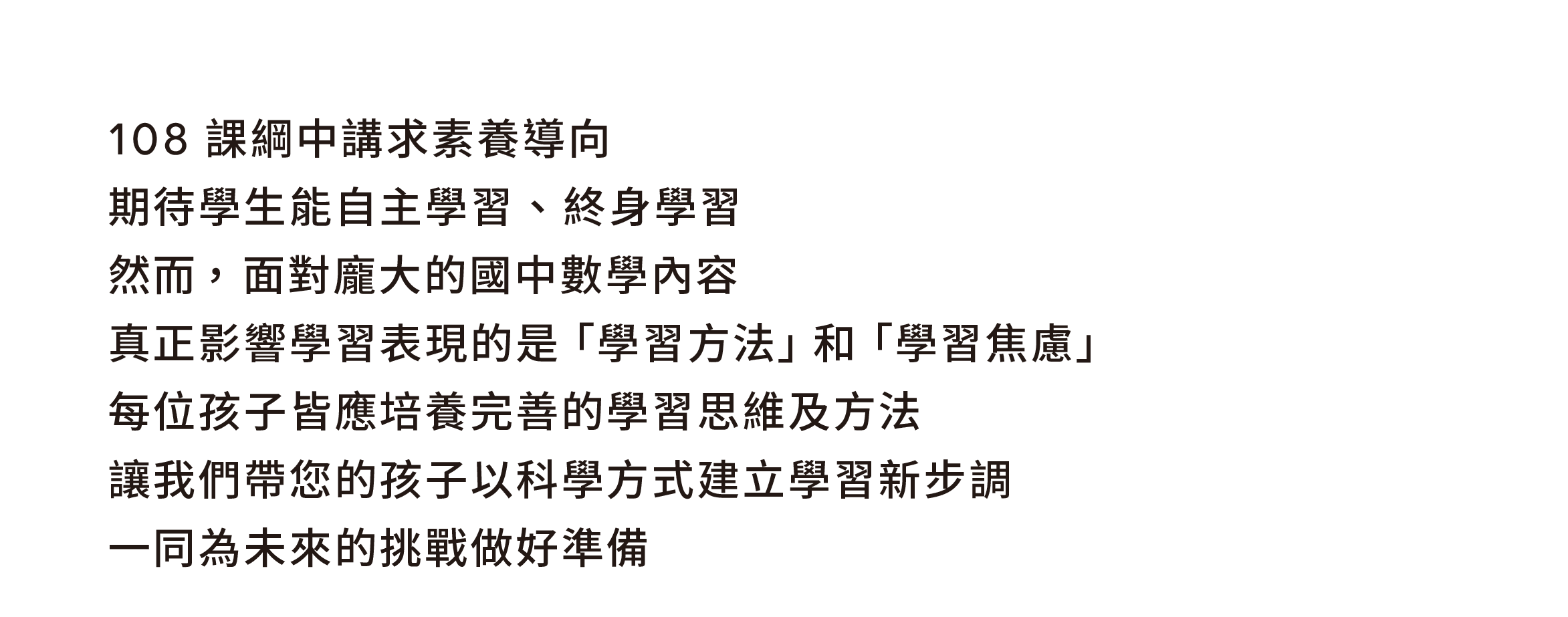 學習思維及方法適合升7~9年級國中學生。課程引導孩子培養成長型思維、克服學習焦慮。基於科學實證和學理依據,提供孩子有系統且高效率的學習方法,幫助孩子發展自主學習能力,為終身學習奠定基礎。