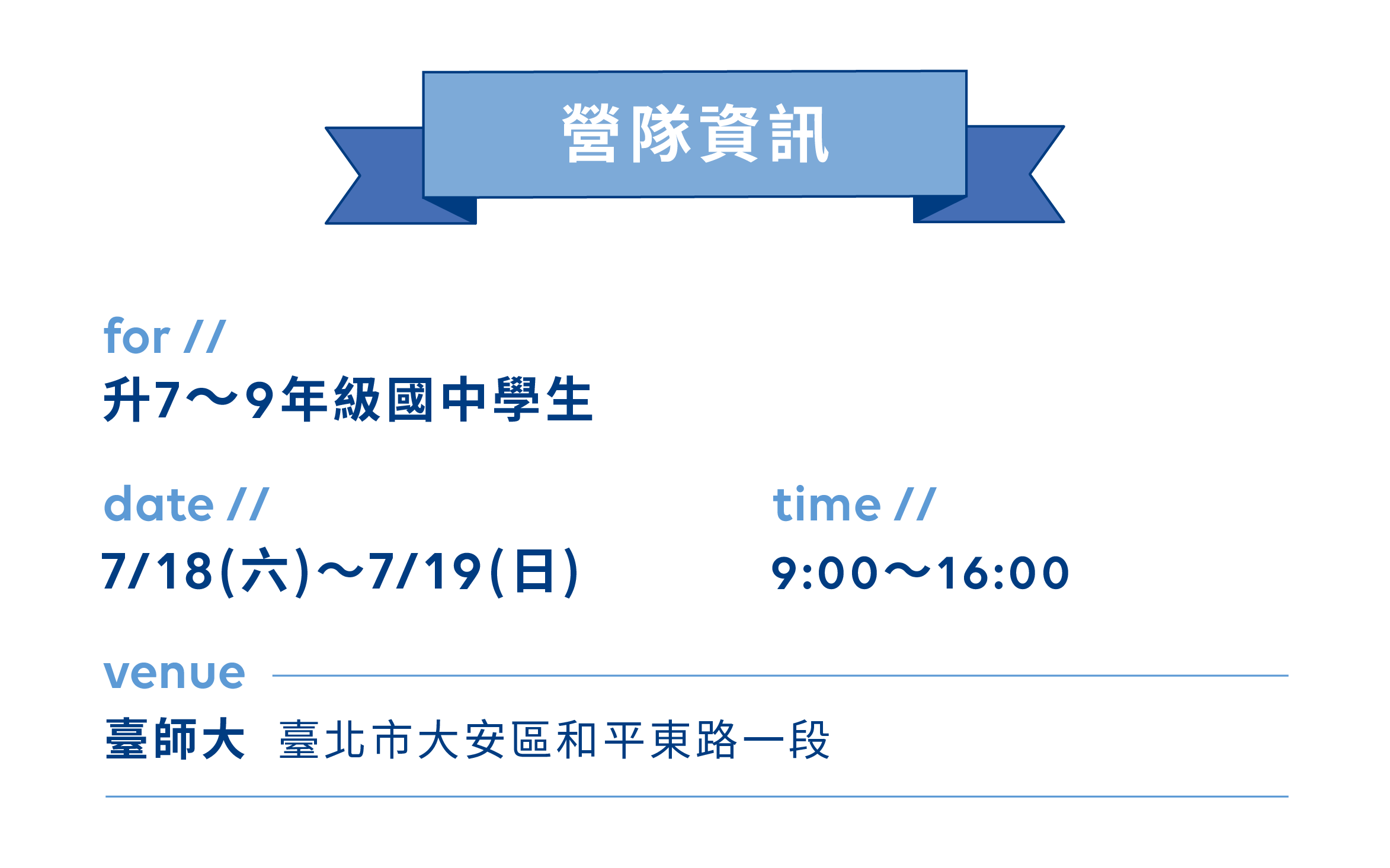 ➤ 主辦單位將於營隊開始前2週通知學員分配班級,為維護全體學員權益,公告後恕無法異動。