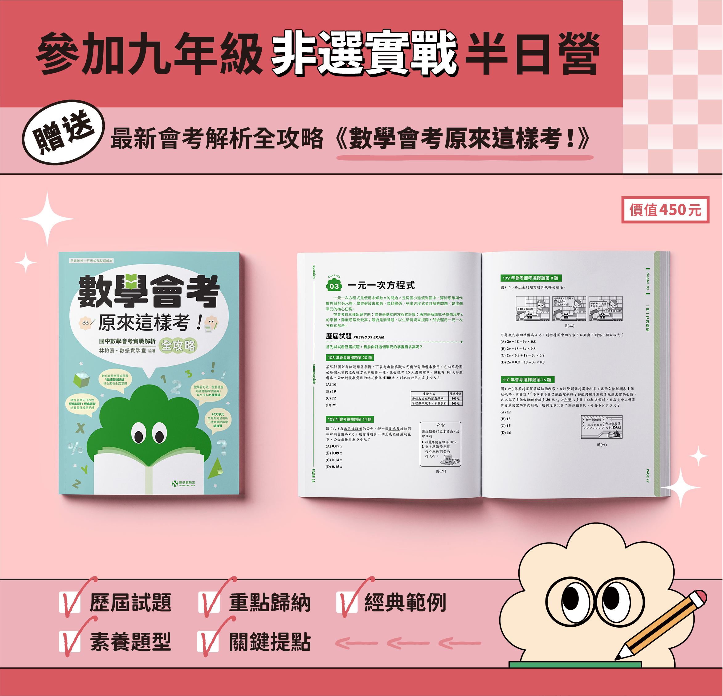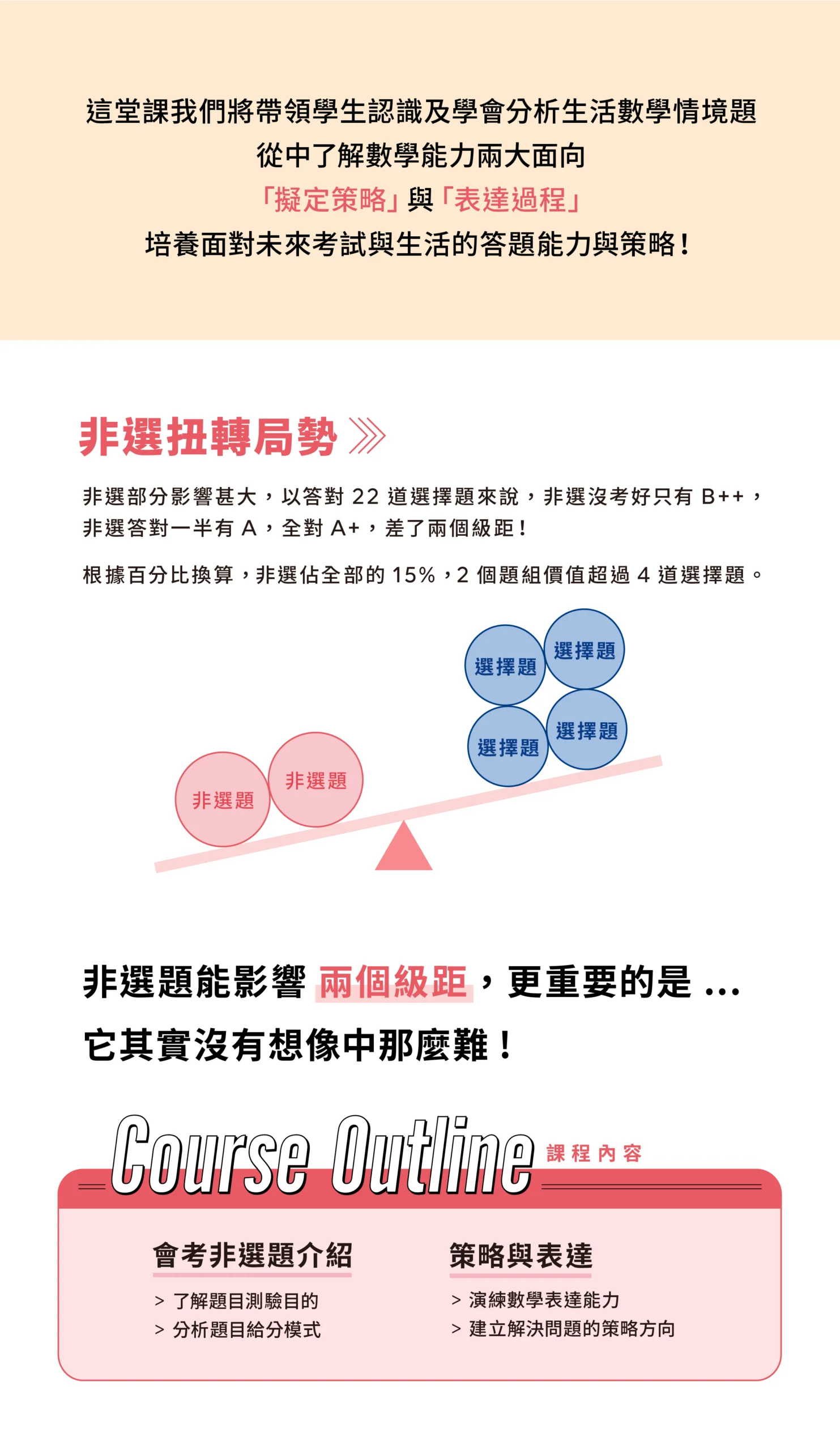 非選實戰適合升9年級國中學生。課程帶領孩子認識並學習分析生活中的數學情境題,從中了解數學能力的兩大面向:「擬定策略」與「表達過程」,掌握數學會考非選題的答題關鍵要點!