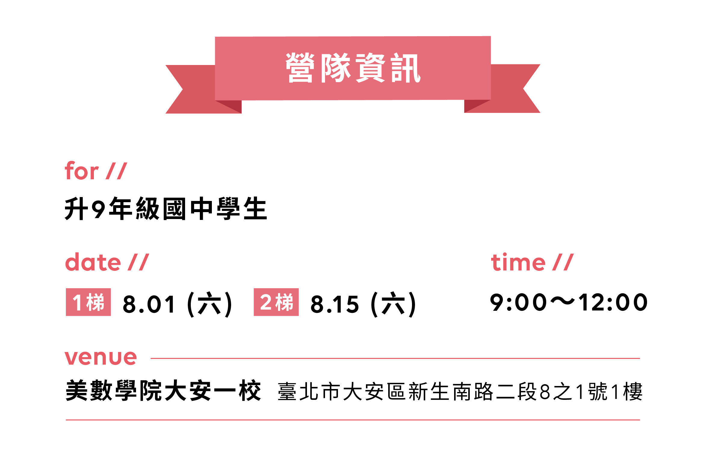➤ 營隊招收升9年級國中學生。考量學員學習品質、課程內容及同儕互動,恕無法接受升7~8年級國中學生報名。