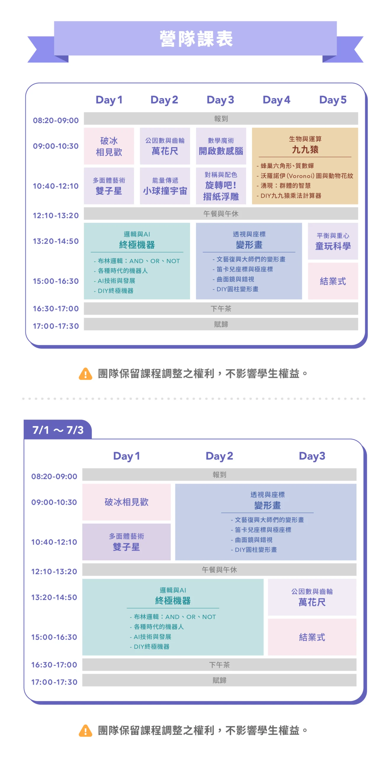 ➤ 營隊採1~3個年級分班上課,例如:升3~4年級班、升4~5年級班、升3~5年級班等。主辦單位將依報名狀況進行分班,恕無法指定班級。
