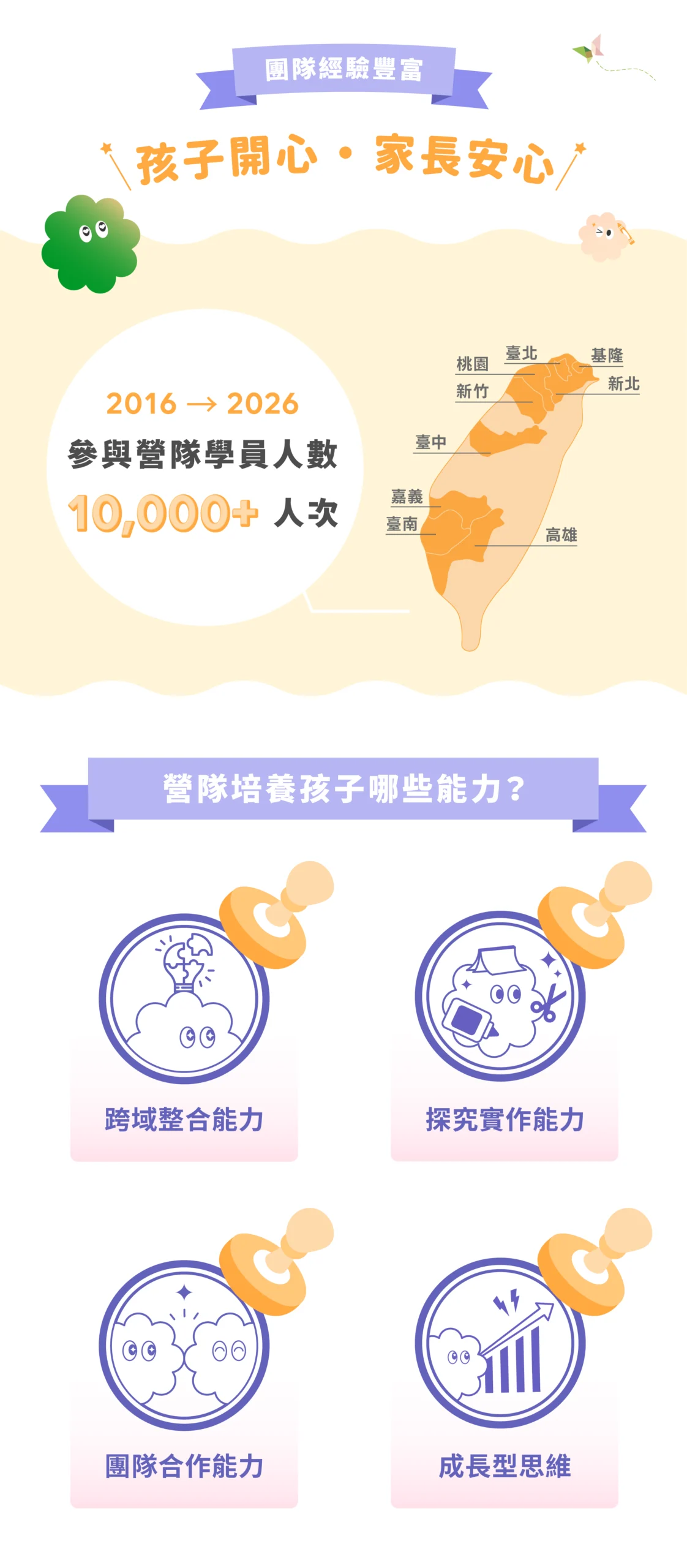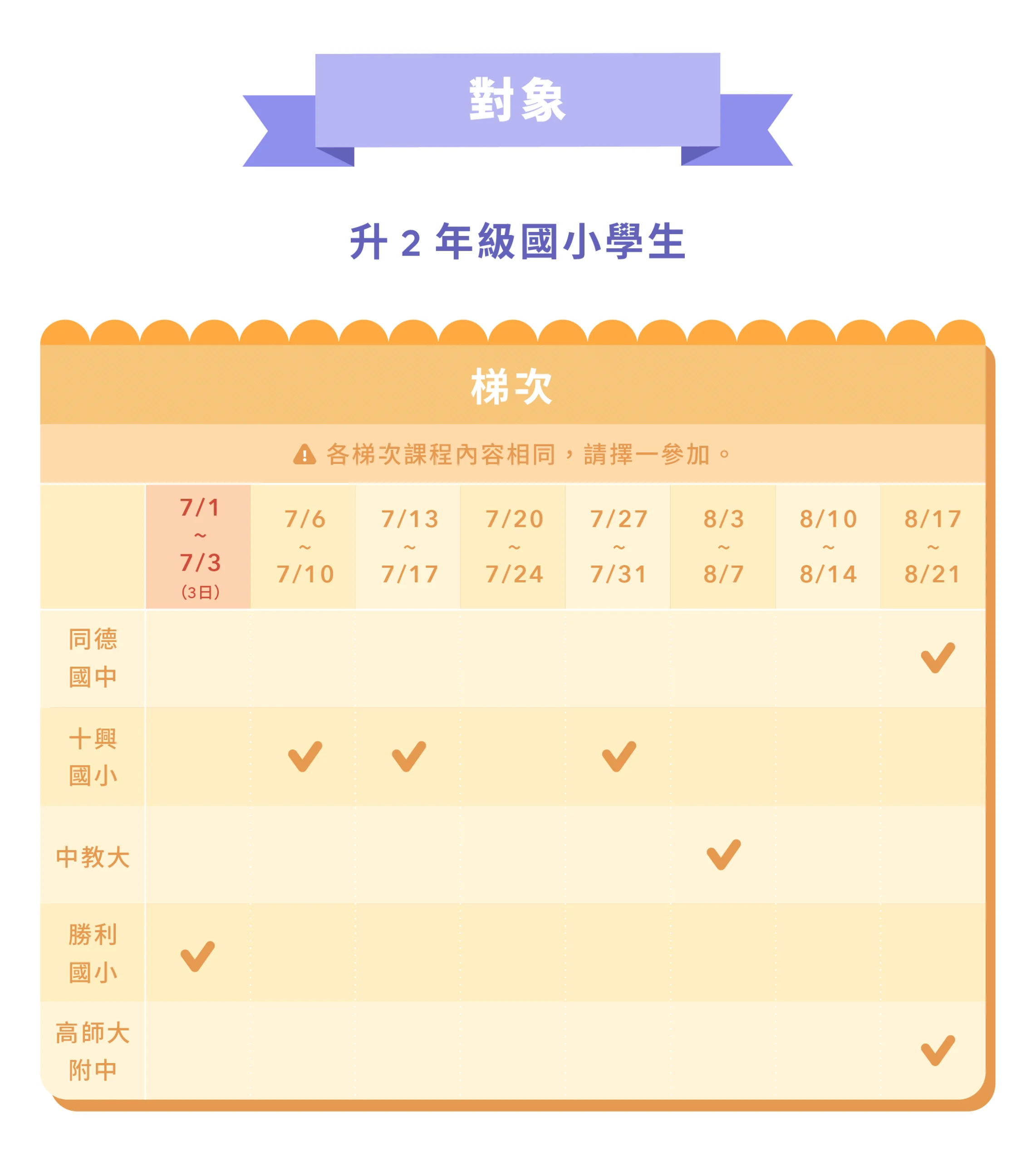 ➤ 營隊招收升2年級國小學生。考量學員學習品質、課程內容及同儕互動,恕無法接受升1年級國小學生報名。