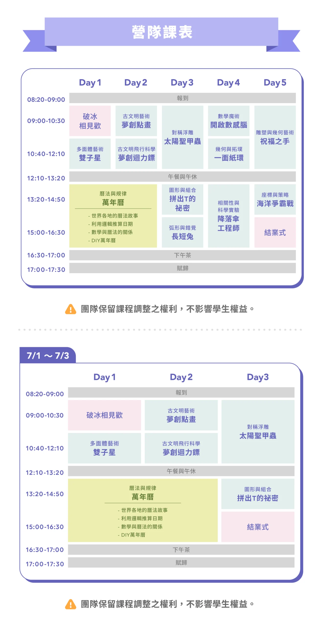 ➤ 營隊期間,若因不可抗力因素致使營隊停課,主辦單位將擇一採取以下替代方案: