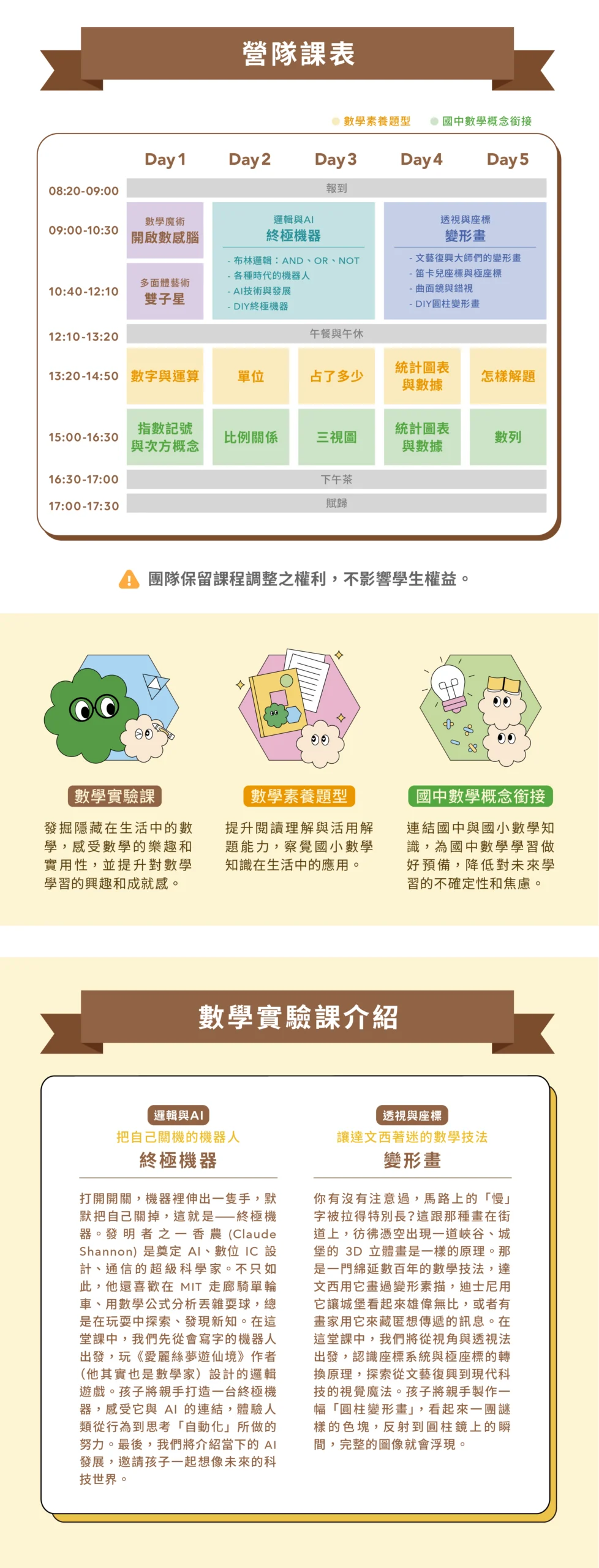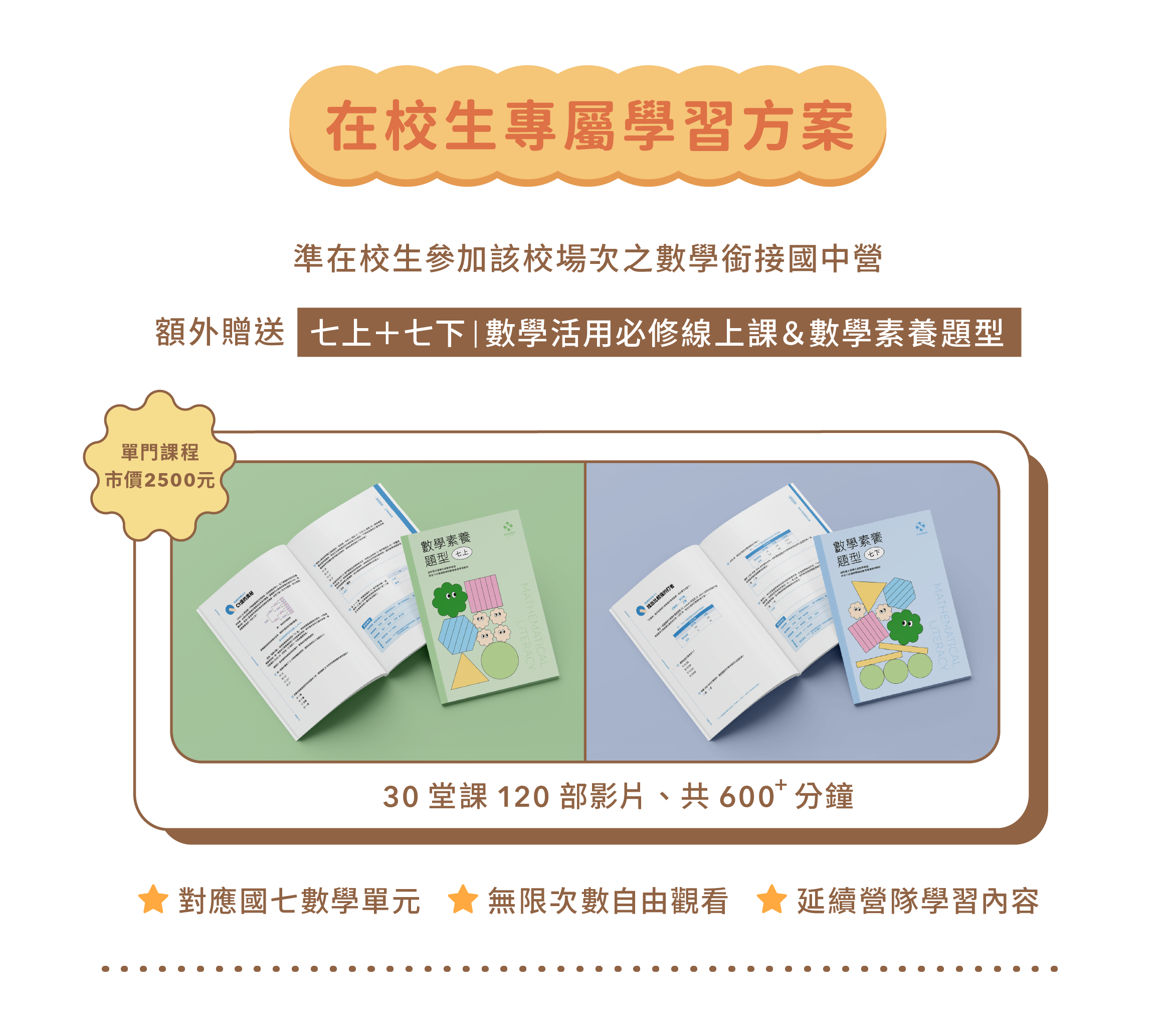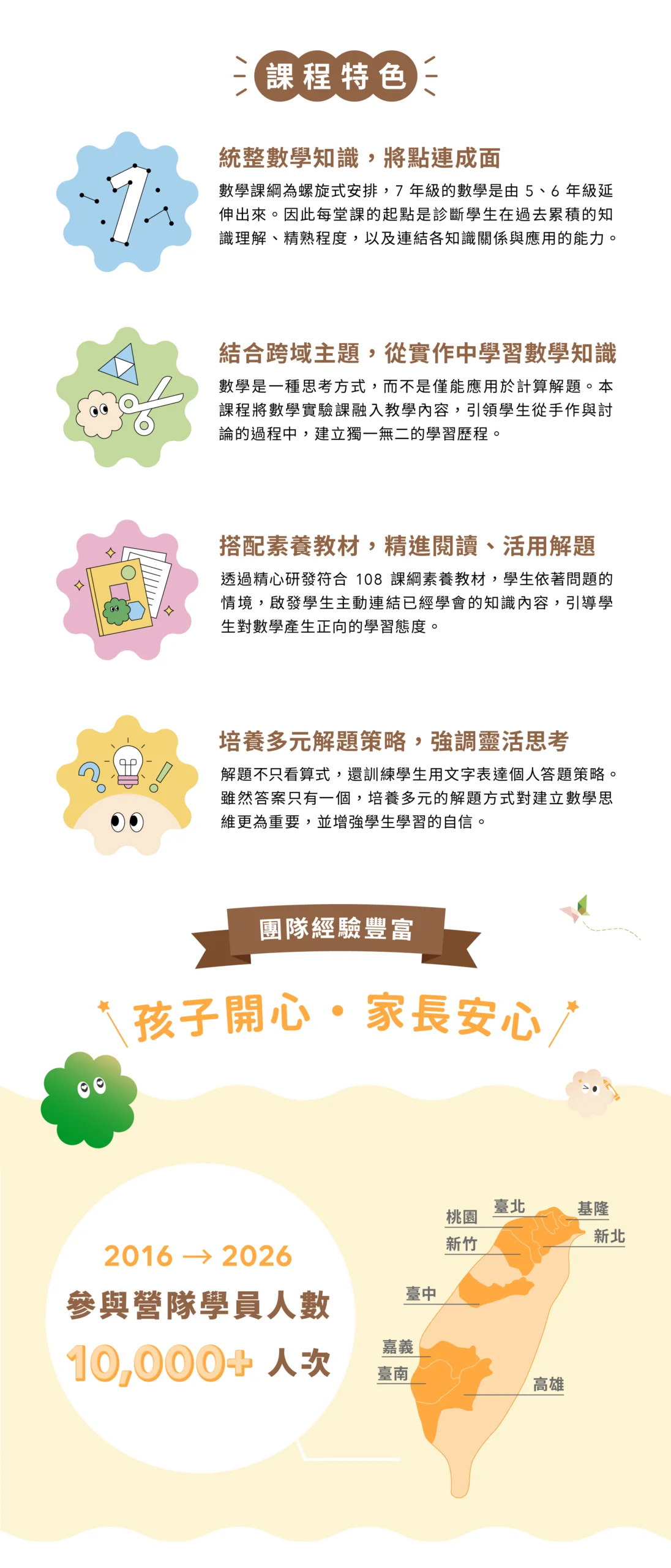 數學銜接國中營適合升7年級國中學生。108課綱強調數學學習不僅是知識的掌握,更重視情意與態度的培養。因此,數學銜接國中營特別規劃了3大課程:「數學實驗課」、「數學素養題型」與「國中數學概念銜接」,旨在幫助孩子建立正向的學習態度,提升對數學的興趣與信心,為未來學習做好預備。