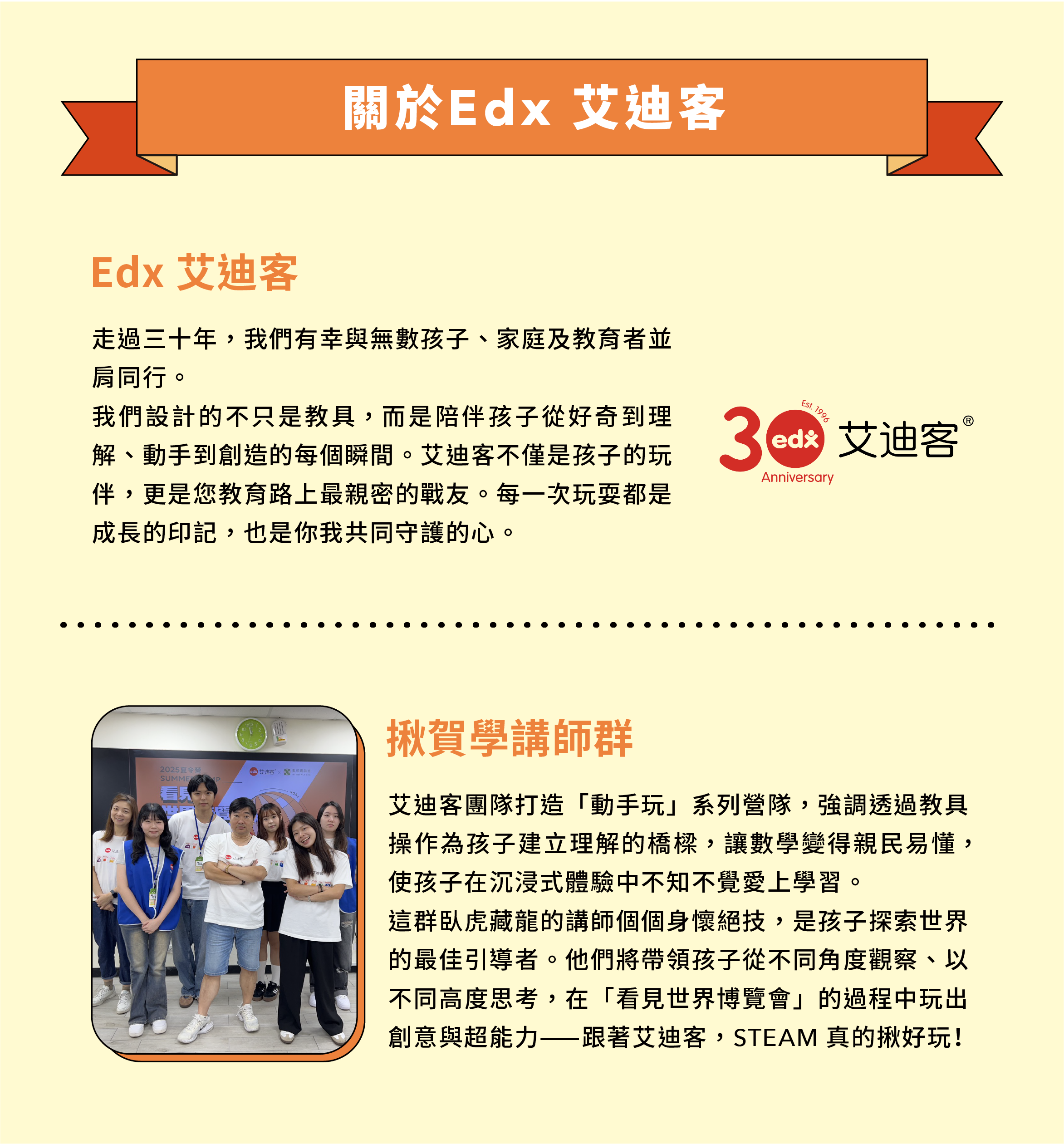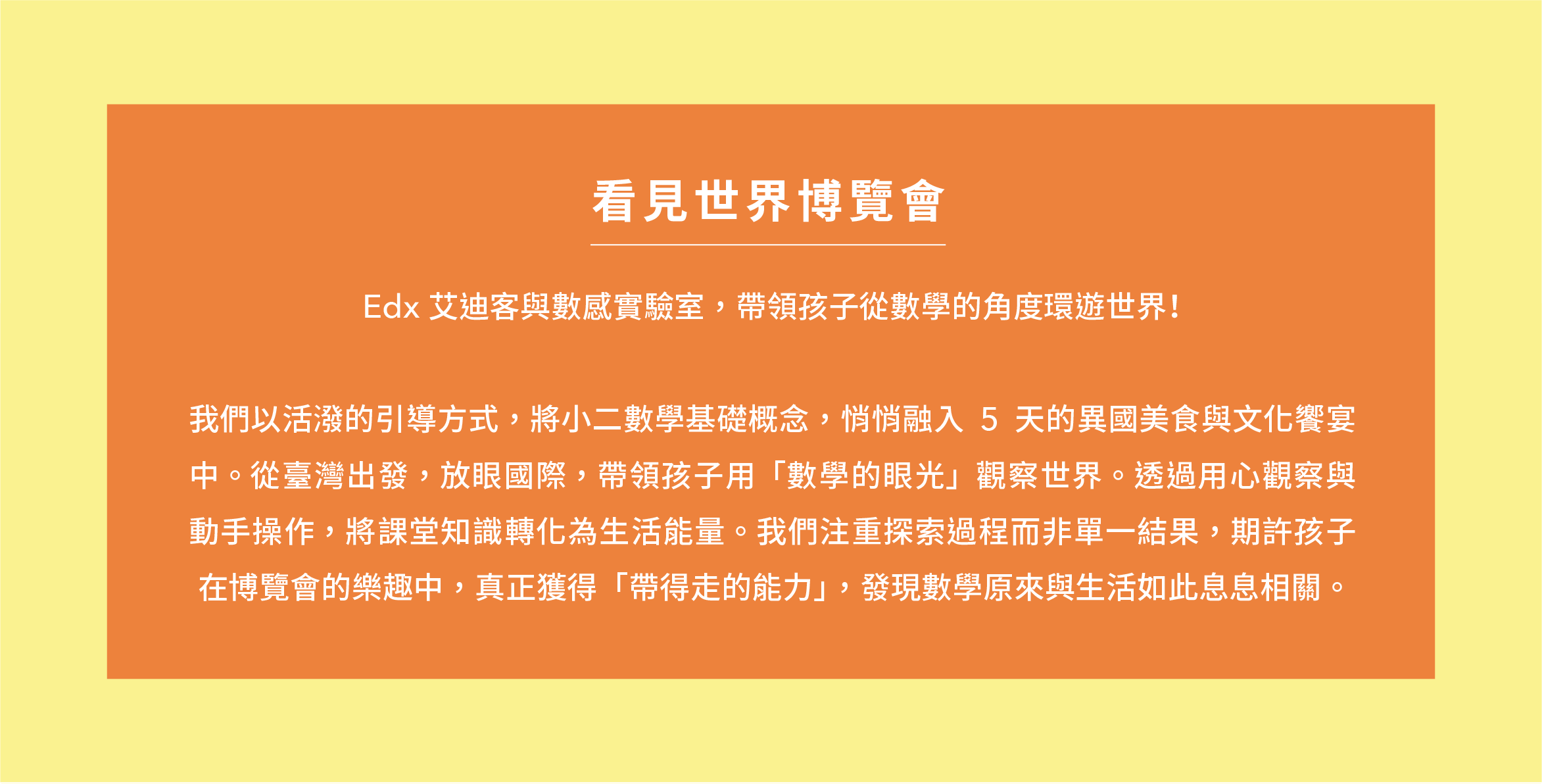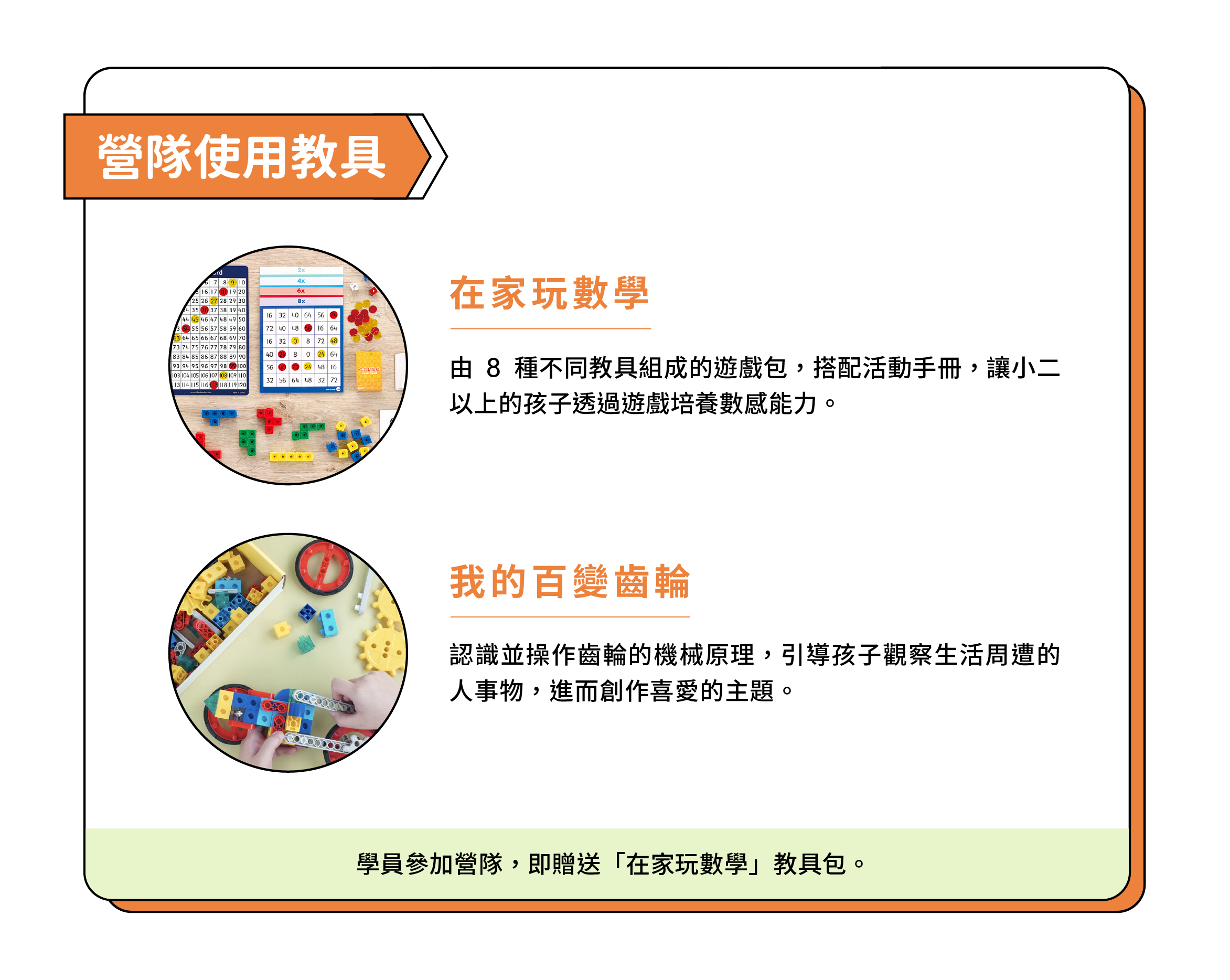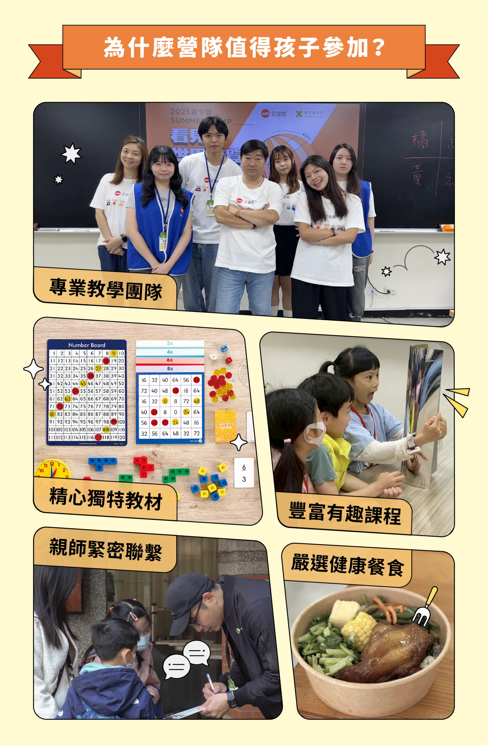 數感實驗室與臺灣MIT益智教具品牌艾迪客聯手推出,專為升2年級國小學生設計的營隊。透過教具操作和遊戲探索,讓孩子在「做中學」過程中,發掘隱藏在生活中的數學,感受數學的樂趣,並且提升對數學學習的興趣和自信。