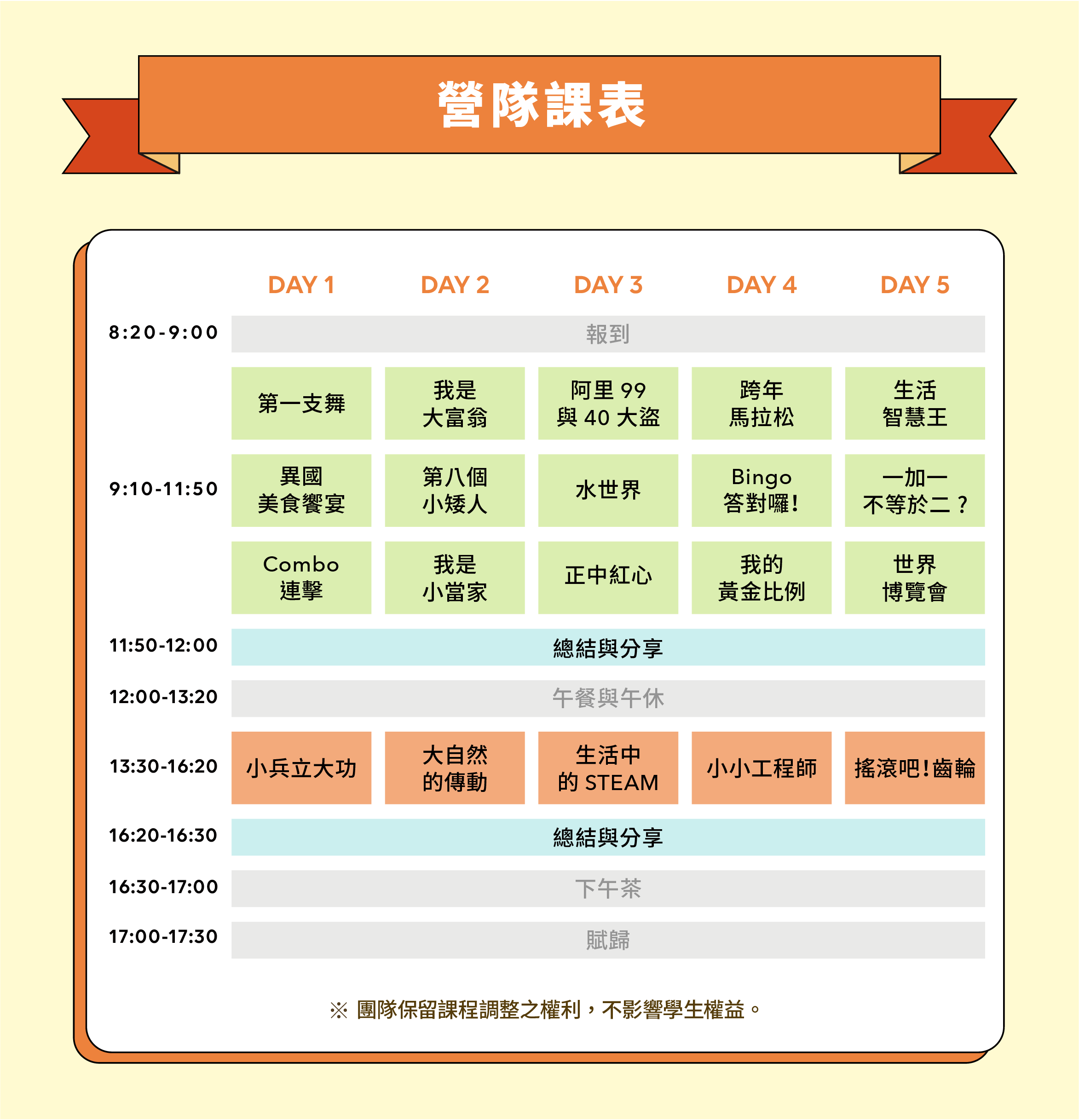 ➤ 學員報到時間為早上8:20~9:00,家長接回時間為下午17:00~17:30。