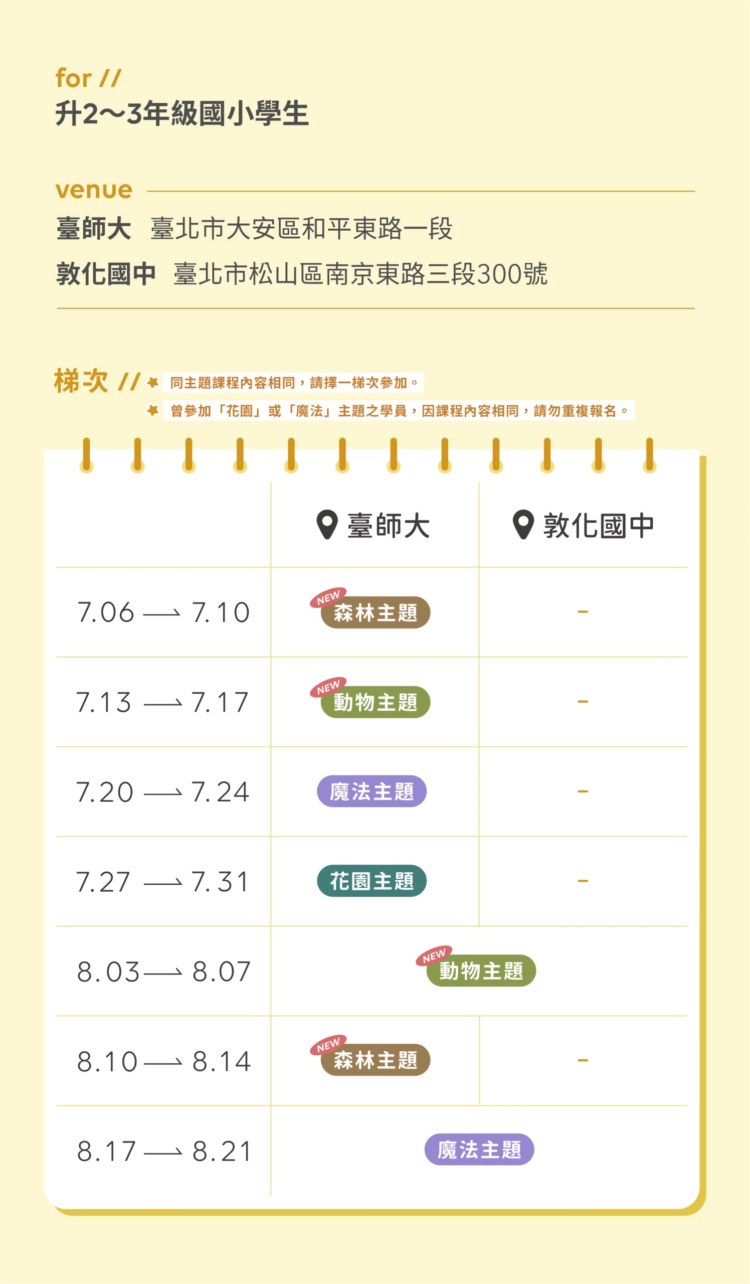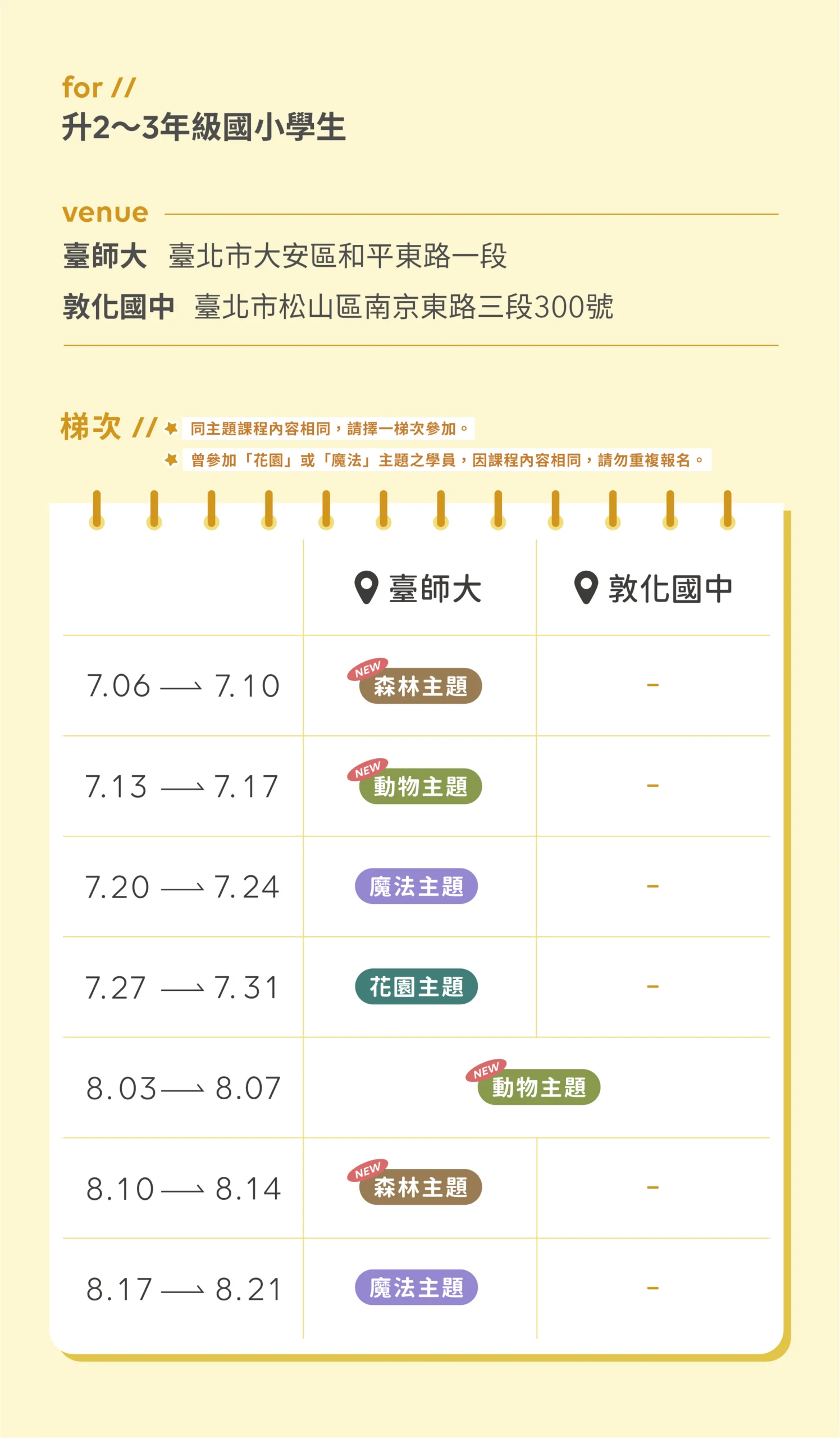 ➤ 營隊招收升2~3年級國小學生。考量學員學習品質、課程內容及同儕互動,恕無法接受升1年級國小學生報名。