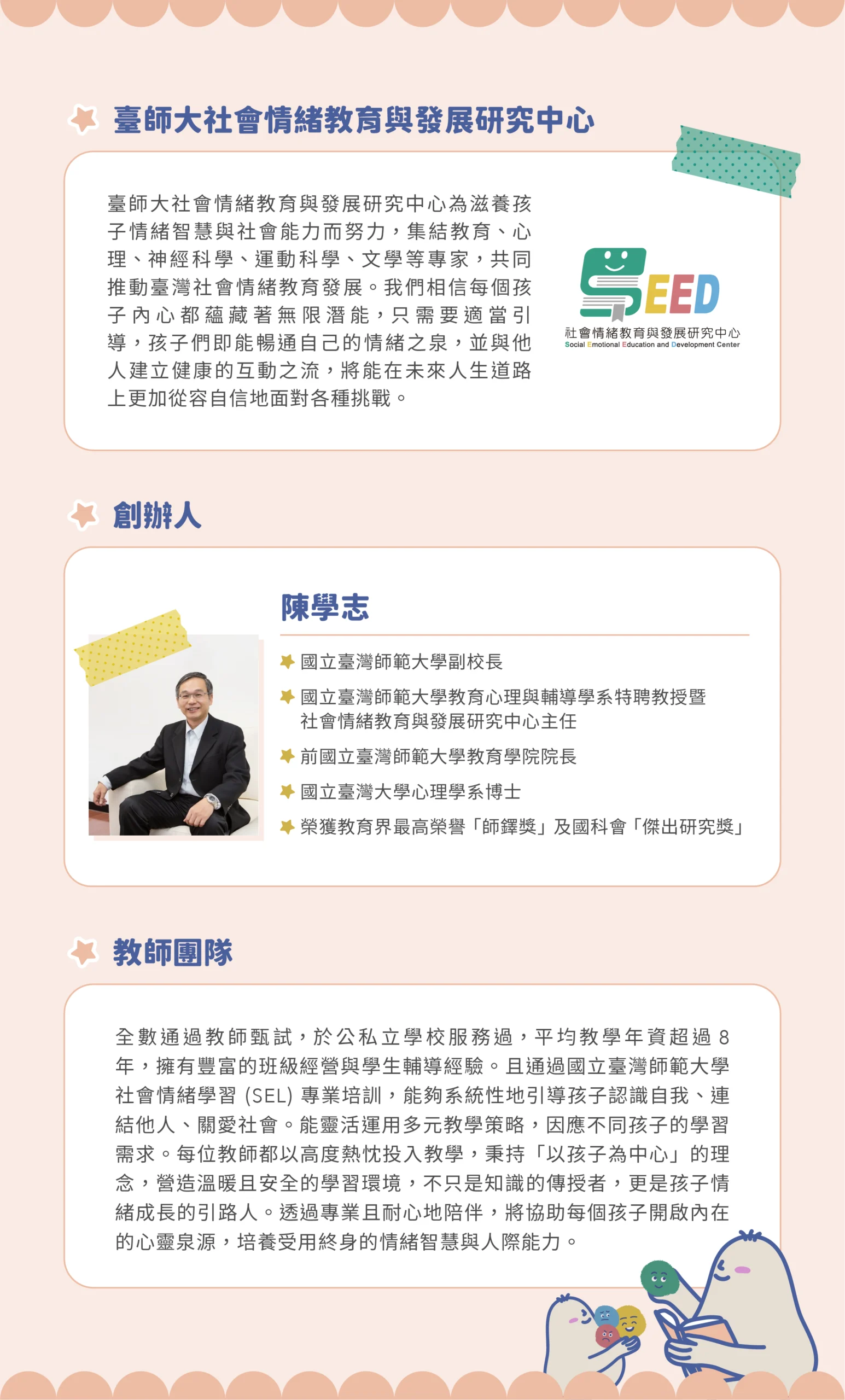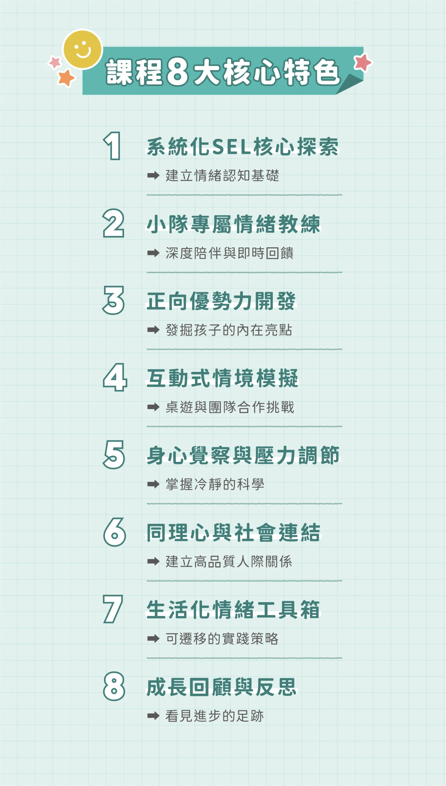 數感實驗室與臺師大社會情緒教育與發展研究中心聯手推出,專為升2~3年級國小學生設計的營隊。透過故事劇場、五感探索、角色扮演、藝術創作,讓孩子在活動與遊戲過程中,學習情緒覺察與社交溝通的能力,並將所學逐步轉化為生活中的小習慣、大能力,更為未來人生奠定堅實的社會與情緒能力基礎!