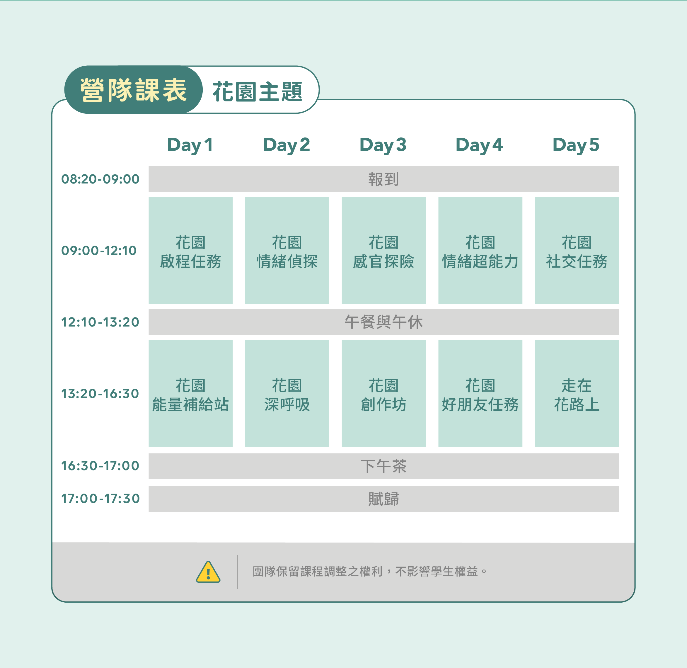 ➤ 學員報到時間為早上8:20~9:00,家長接回時間為下午17:00~17:30。