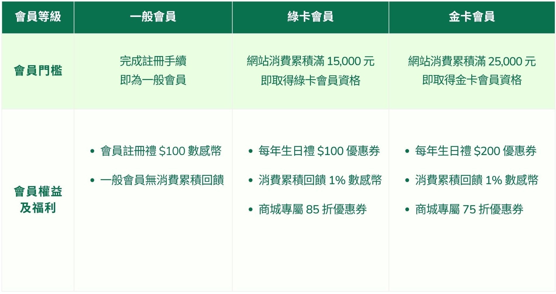 - 本會員制度上線前之舊官網消費訂單紀錄將完整保存,惟不納入會員等級之累計消費金額計算。