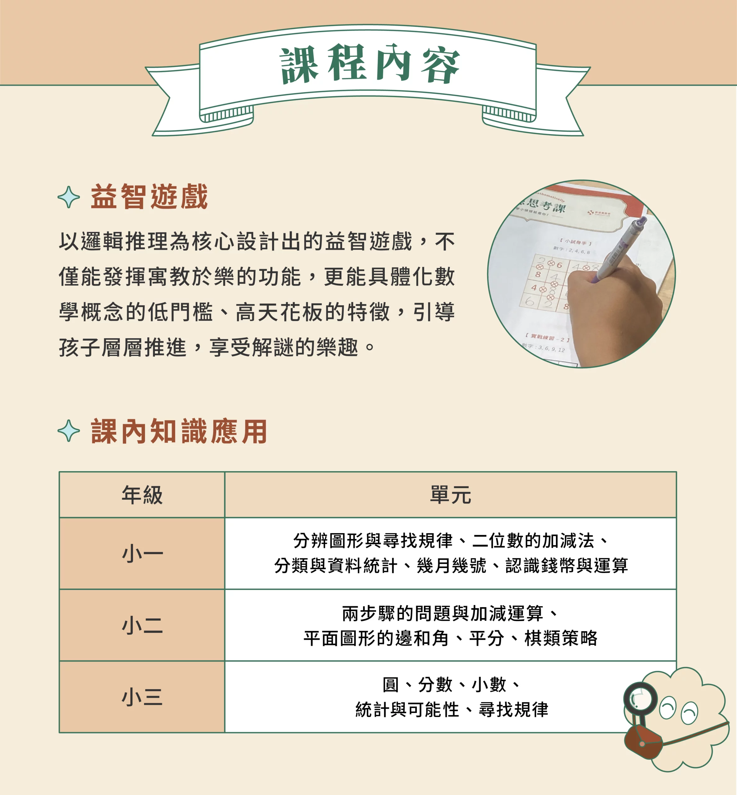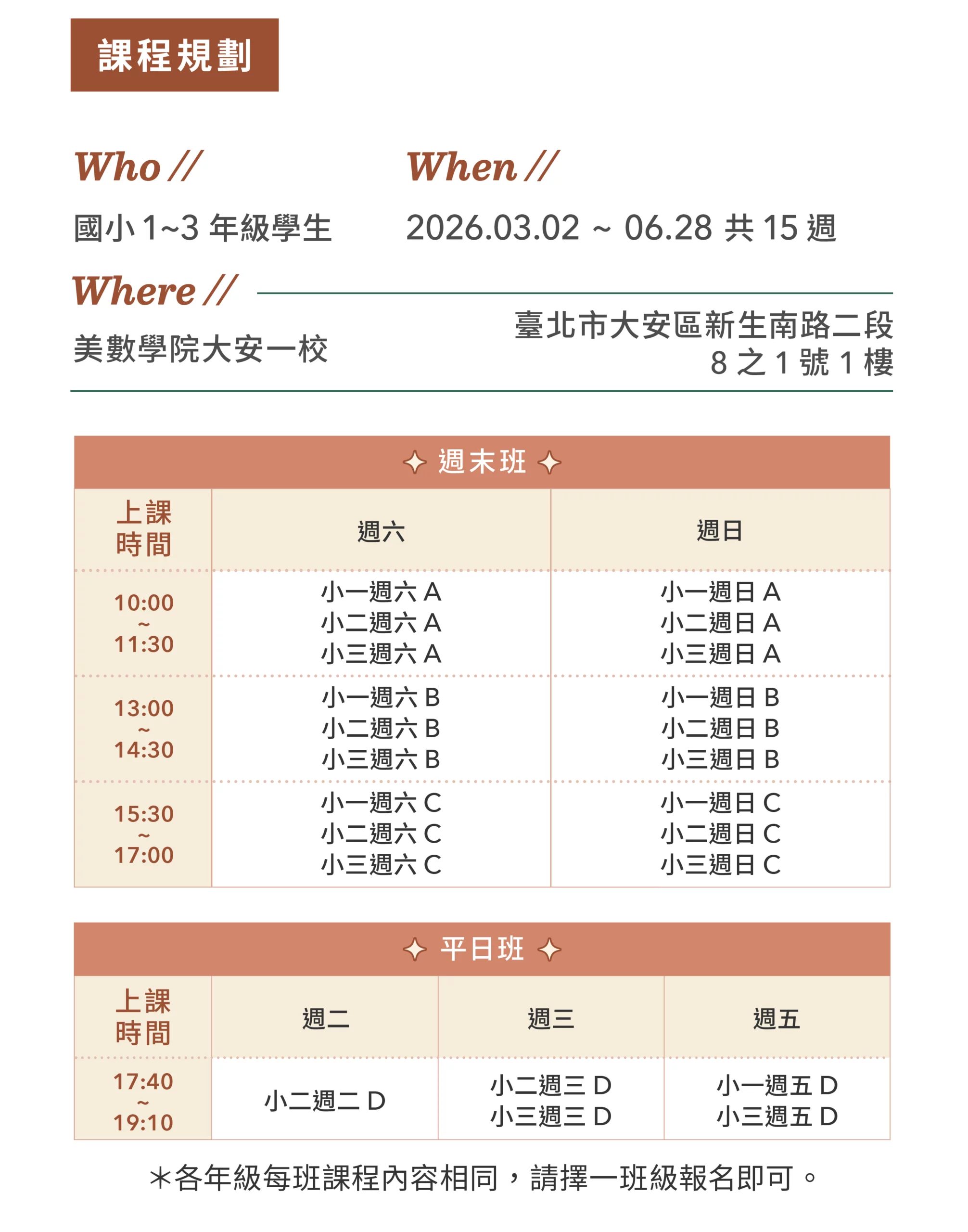 ➊ 課程招收1~6年級國小學生,採分齡上課。考量學員學習品質、課程內容及同儕互動,恕無法接受大班學生報名。