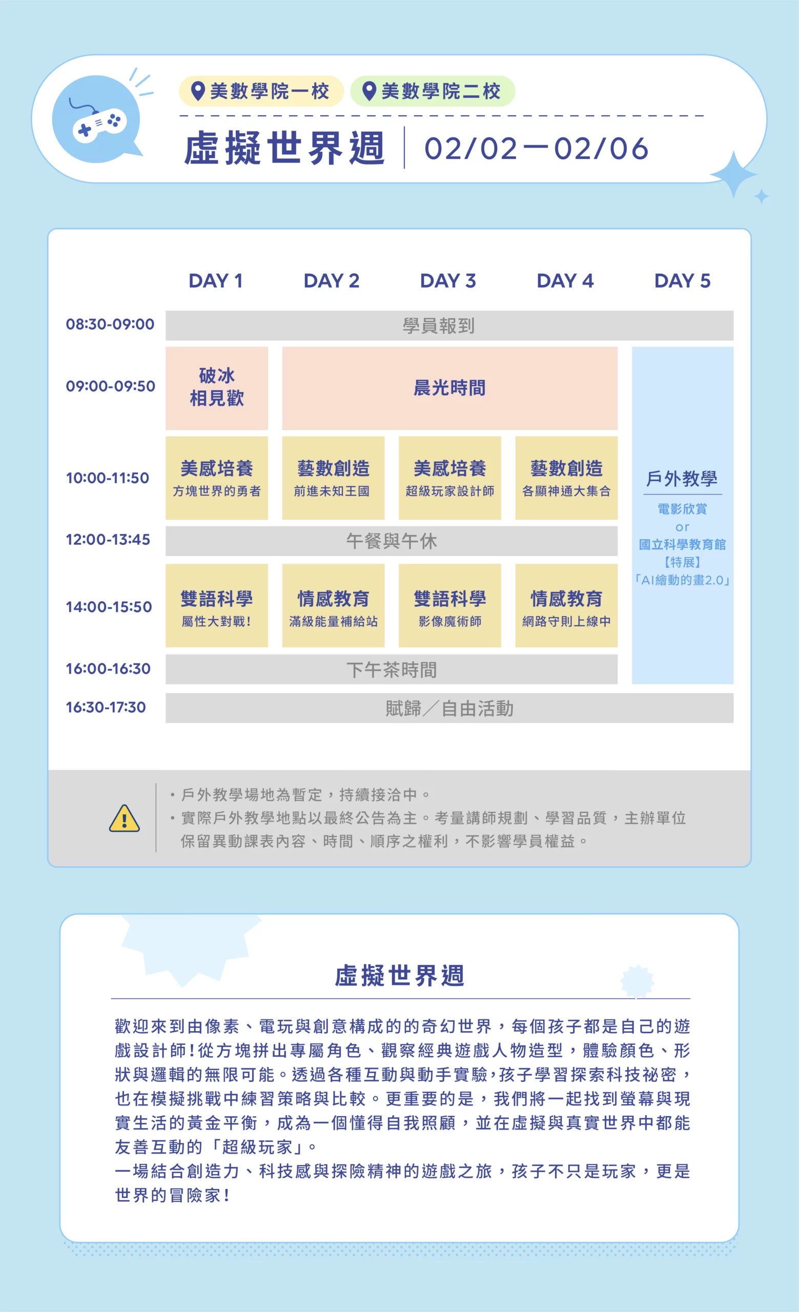 ➋ 為方便家長接送,上學、放學時間皆由老師於學院門口接送學員,確切接送地點將於營隊行前通知信公告。