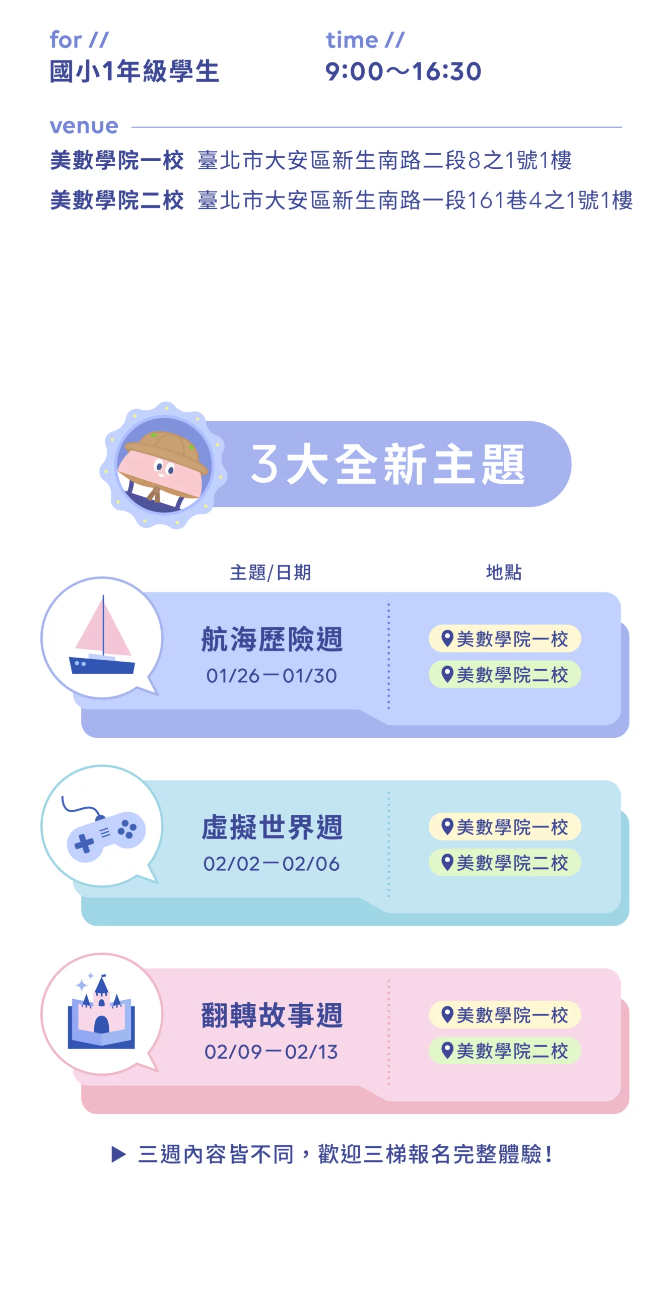 ➊ 營隊招收1~2年級國小學生。考量學員學習品質、課程內容及同儕互動,恕無法接受1年級以下、2年級以上學生報名。