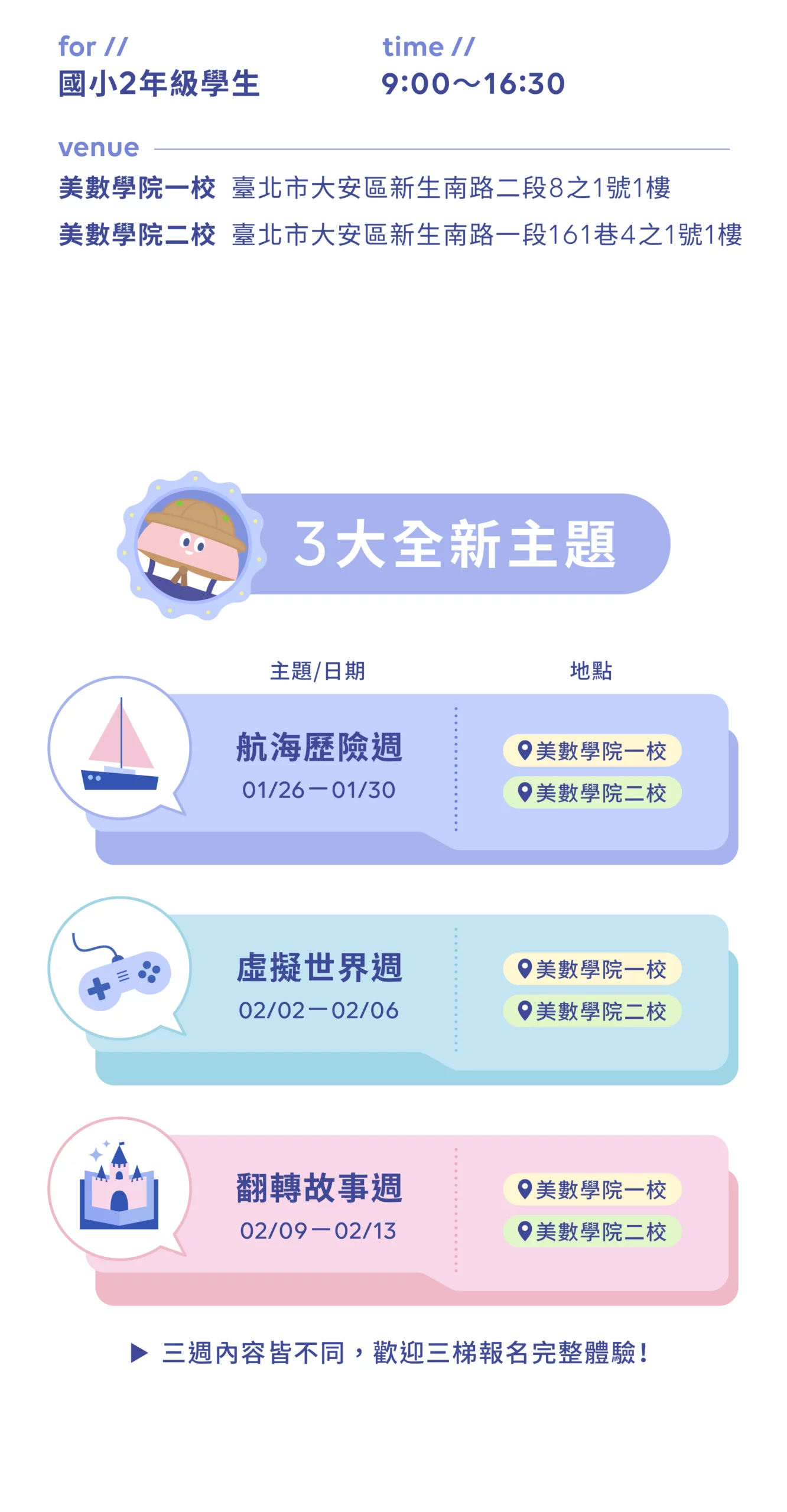 02/02 美數一校|W2虛擬世界週|、02/09 美數一校|W3翻轉故事週|已經額滿。
