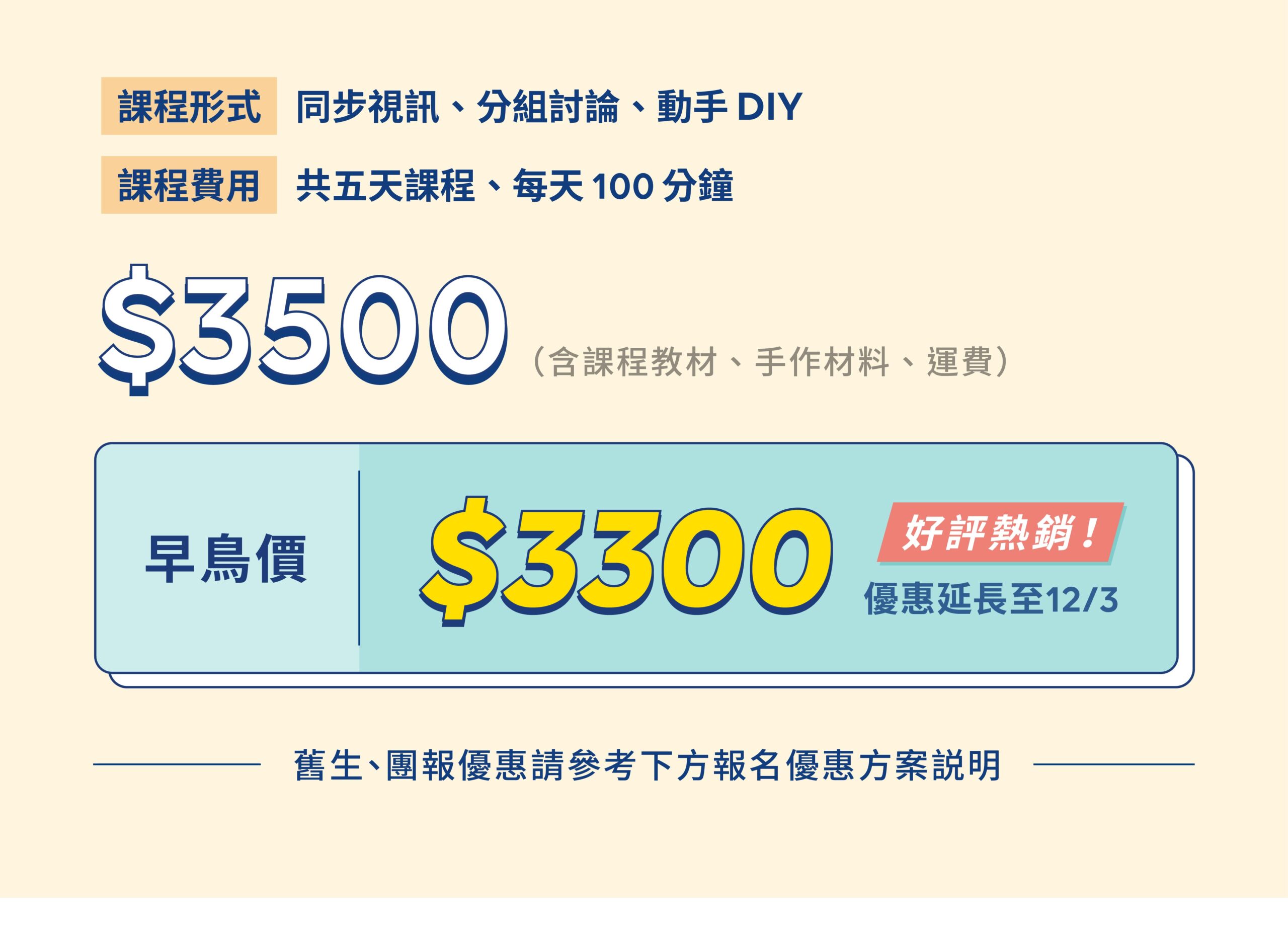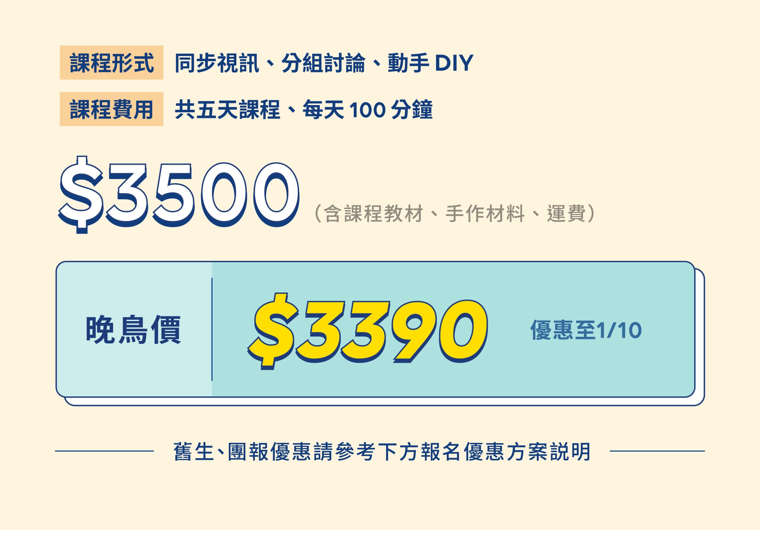 ➌ 為提供學員完整、優質的學習體驗,恕無法接受半日、單日等形式的報名。