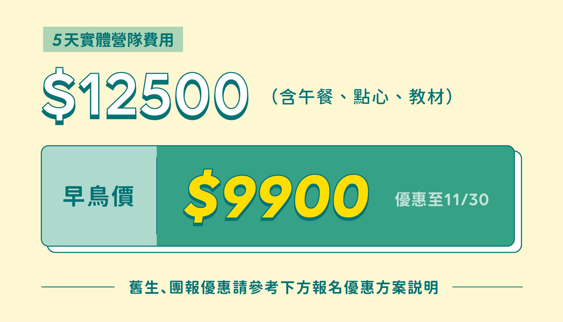 ➍ 若學員無法全程參加營隊,可請事假,主辦單位將提供當日課程教材。因報名完成後即為學員保留整梯次的營隊名額及課程教材,恕無法退還單日學費。