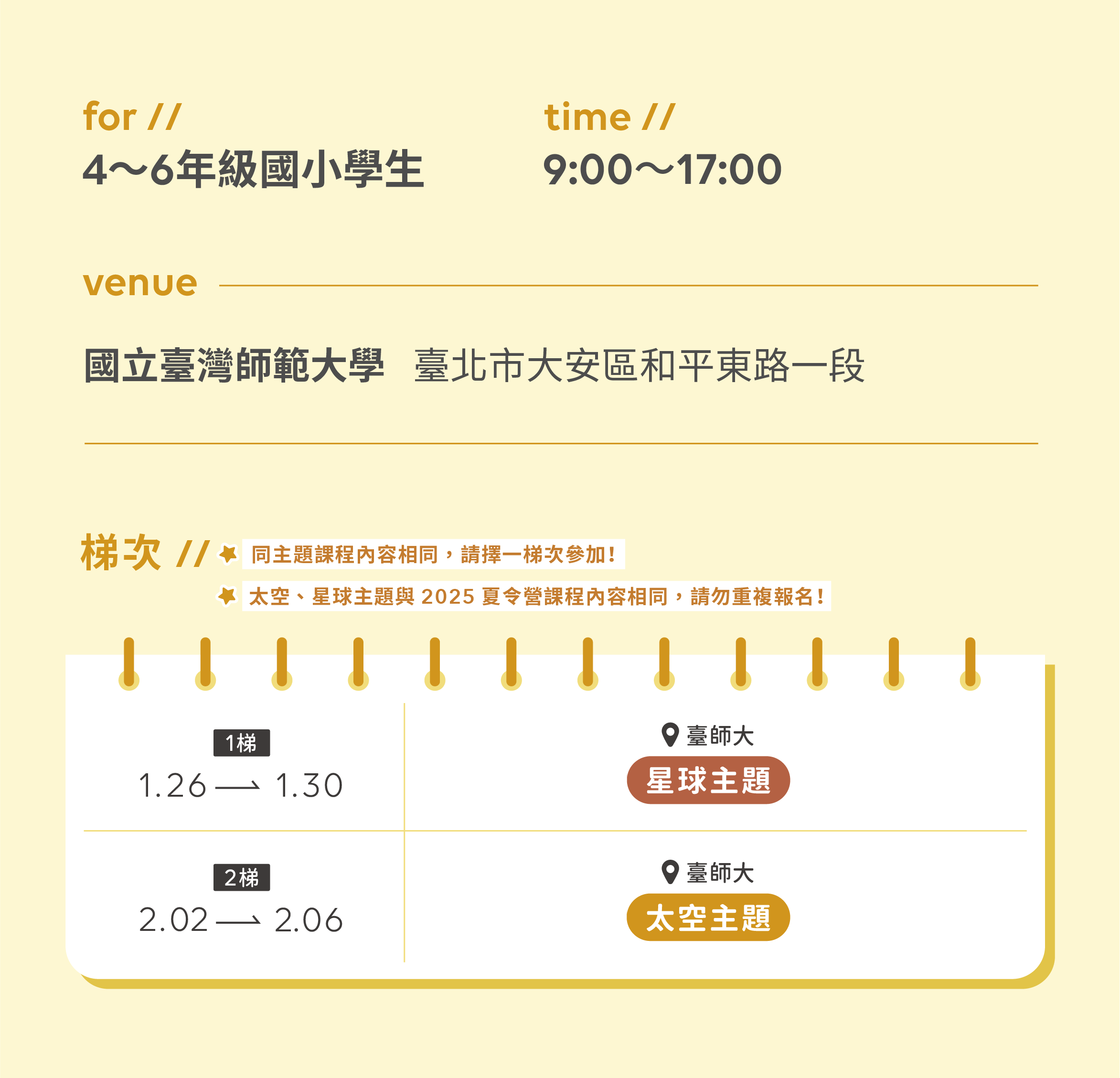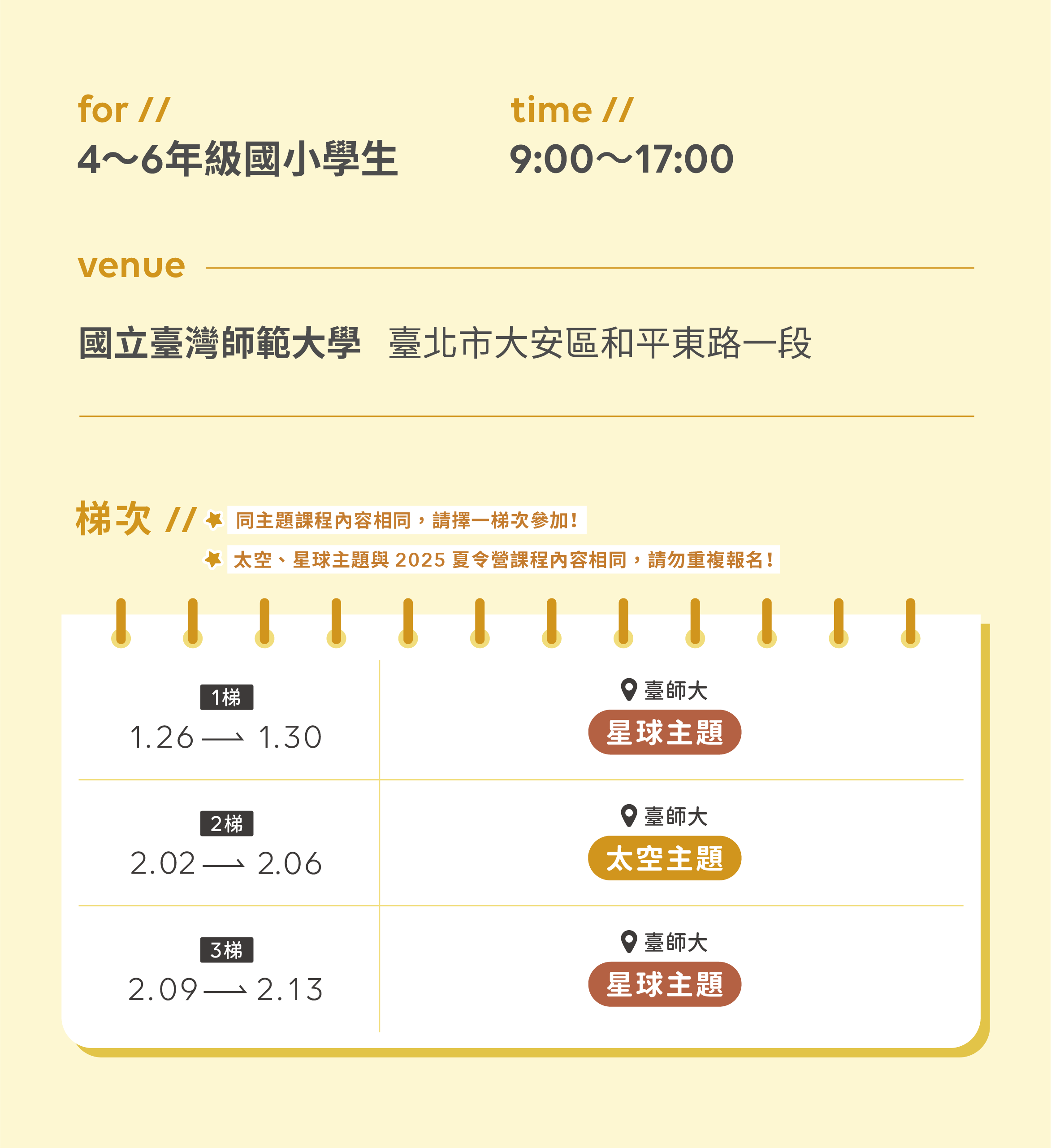 ➊ 營隊招收4~6年級國小學生。考量學員學習品質、課程內容及同儕互動,恕無法接受1~3年級國小學生報名。